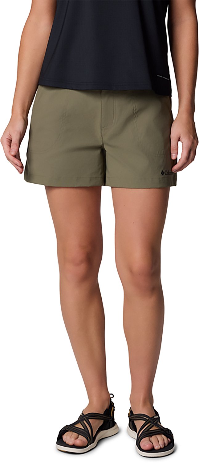 Take on the world in the Columbia Sportswear Women's Brea Falls Shorts 4 in. They are made of 96% nylon and 4% elastane. The Omni-Shade™ UPF 50 guards against skin damage using tight fabric construction and modified fibers to block UVA/UVB rays, so you stay protected in the sun, and their Omni-Shield™ Release resists fluids and stains using quick-drying, stain-releasing yarns, so you stay clean and dry in wet, messy situations. The integrated, removable belt offers a fine-tuned fit.
