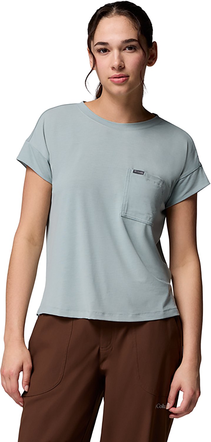 Live comfortably in the Columbia Sportswear Women's Daniela Falls Short Sleeve T-shirt. It is made of 62% recycled polyester, 33% viscose, and 5% elastane. The Omni-Wickâ„¢ technology wicks moisture and dries quickly, and its chest pocket is easily accessible. The vents at the side hem encourage breathability.