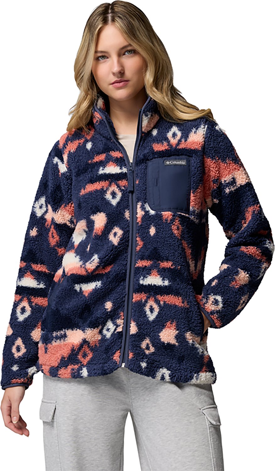 Bundle up with the Columbia Sportswear Women's West Bend Print II Full Zip Jacket. It is made of 100% polyester. The hand pockets keep you warm, and its chest pocket has a side hook and loop closure. The zipper pull is easy to reach.