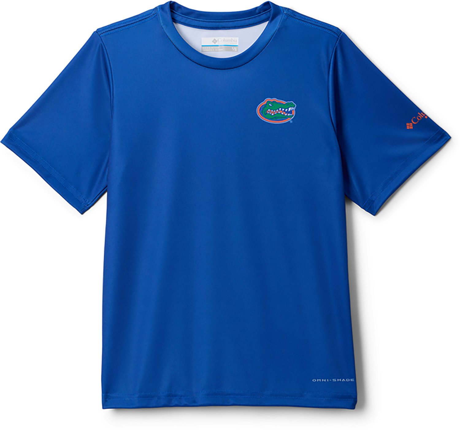 Gear up for game day with the Columbia Sportswear Youth University of Florida CLG Terminal Tackle Graphic T-shirt. The polyester material provides a comfortable feel, while the Omni-Wick technology helps keep you cool and dry. Built-in Omni-Shade UPF 50 sun protection shields against harmful UVA/UVB rays, and the school logo shows off your Gators pride.