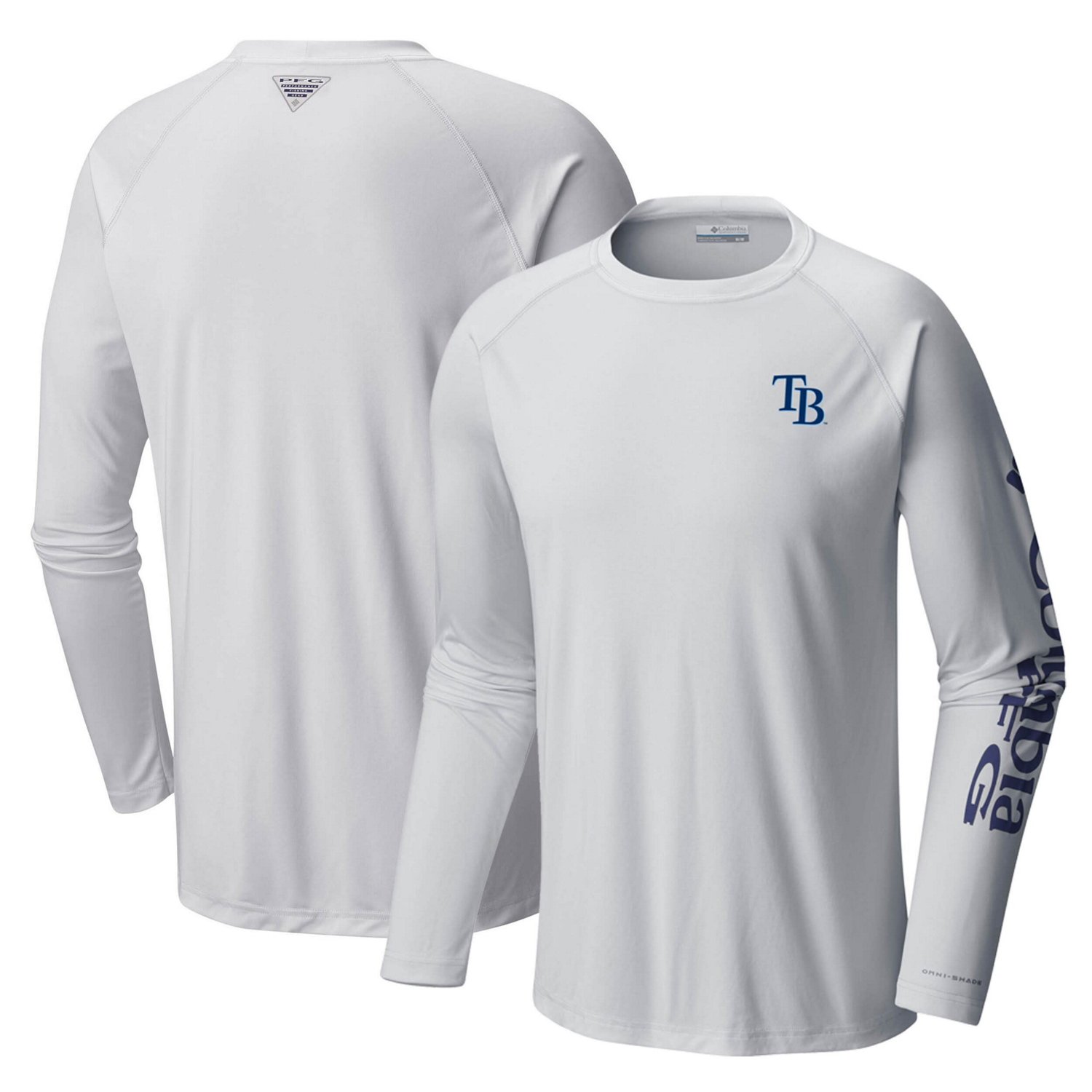 The Men's Columbia White Tampa Bay Rays Terminal Tackle Long Sleeve T-Shirt is the perfect way to show your support for the Tampa Bay Rays Made from lightweight polyester this shirt features raglan sleeves for a comfortable fit and flatlock stitching for durability The screen print graphics proudly display the Tampa Bay Rays logo and the UPF 50 sun protection will keep you safe from the sun's harmful rays Whether you're cheering on the Rays at the stadium or just relaxing at home this shirt is a must-have for any fan