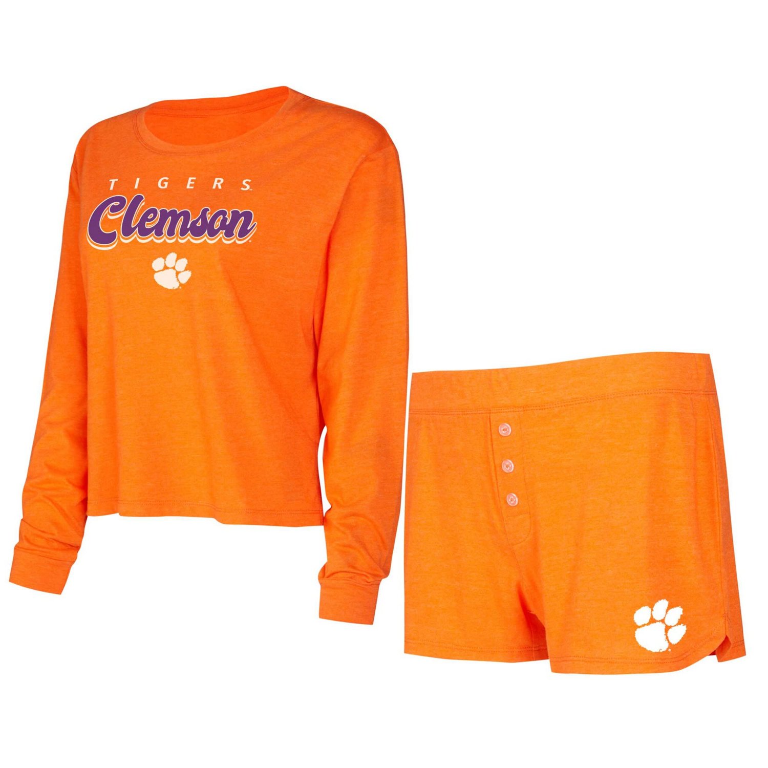 Cheer on your Clemson Tigers at home in the comfort of this Team Color set from Concepts Sport It features Clemson Tigers graphics printed on the matching T-shirt and shorts The blended material feels comfortable to wear for hours on end