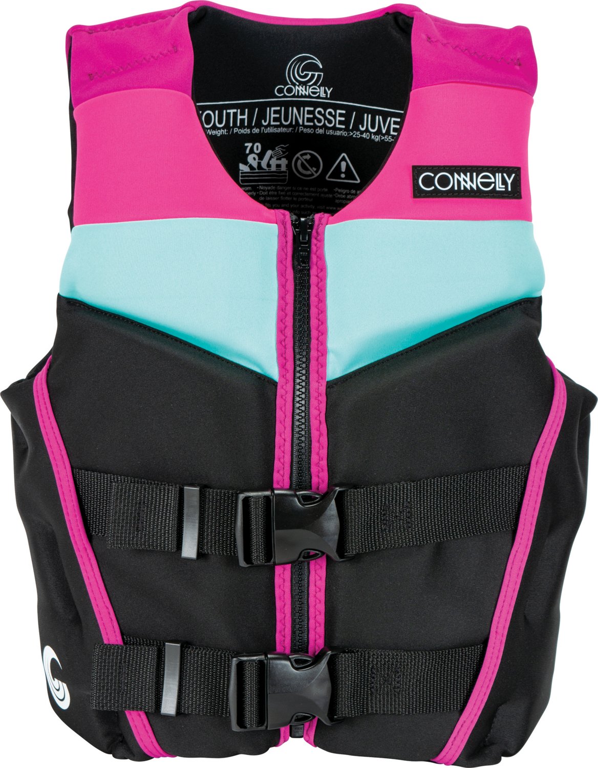 Stay safe on the next boating trip Connelly Girls' Neo Life Vest. The neoprene PVC construction affords durability, while the segmented foam promotes mobility. The center zip and V-back flex panel afford flexibility, and the sublimated graphics deliver a stylish look.