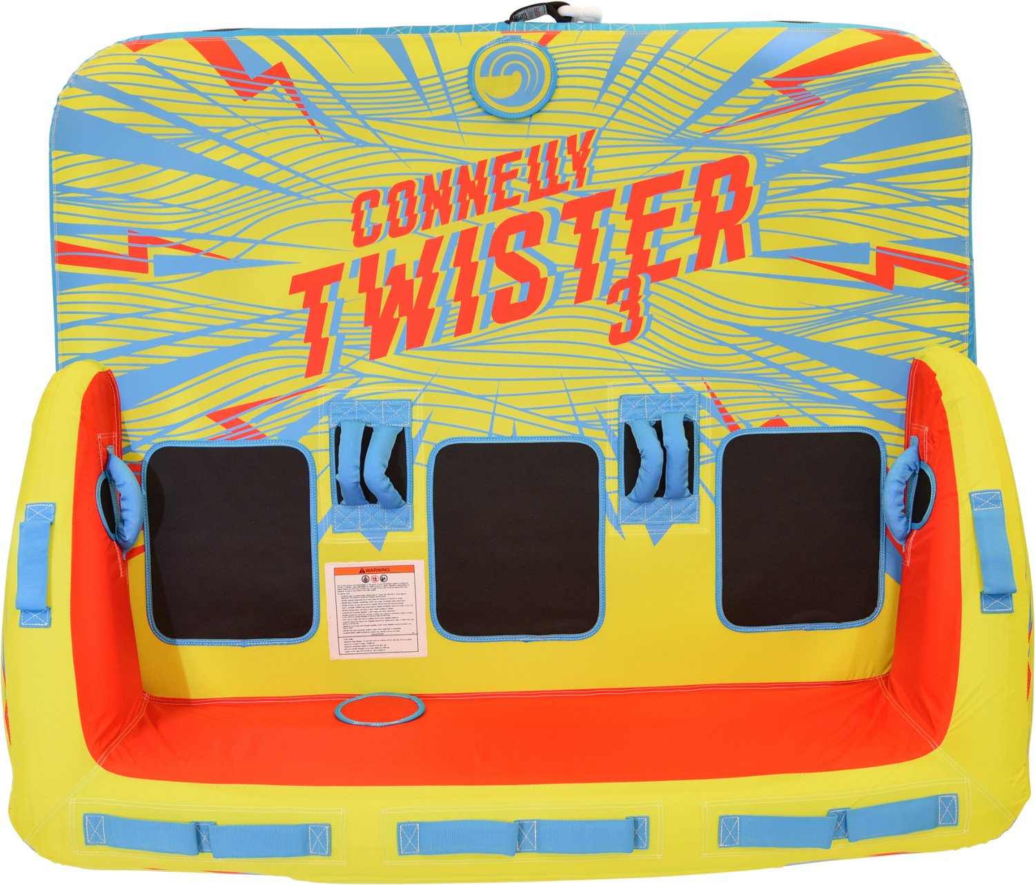 Hang out and relax on the Connelly Twister 3-Person Towable Tube. The 840-denier nylon cover and heavy-duty bladder afford durability, while the 6 padded handles, knuckle guards and grab straps offer safe riding. A covered mesh bottom makes it easy to drain excess water, and the Boston valve enables quick and easy inflation.