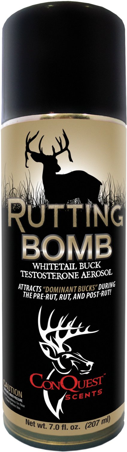Designed to help you enjoy a successful hunting season, the ConQuest Rutting Bomb delivers the scent of Whitetail buck testosterone. This bomb can be dispensed all at once or in bursts for controlled application, and the atomizing nozzle helps it stick to vegetation. Made in USA.