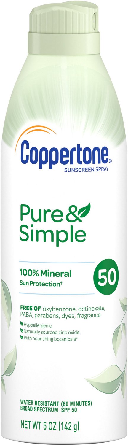 Stay protected from the sun with the Coppertone Pure and Simple SPF 50 Sunscreen Spray. This SPF 50 spray sunscreen offers 100% mineral sun protection based on a naturally sourced active zinc oxide ingredient. The spray delivers broad spectrum UVA and UVB protection and is made from a durable, water resistant formula with nourishing botanicals like tea leaf, sea kelp, and lotus extracts.