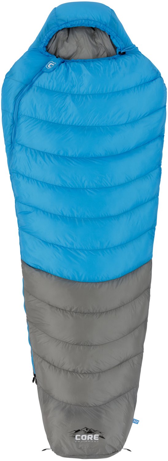 Stay warm and comfortable while camping with the CORE Equipment 30°F Mummy Sleeping Bag. This sleeping bag is made of soft nylon for comfort and features a polyester fill for warmth. It keeps you warm in temperatures as low as 30°F, and it has a hood to hold heat in. The built-in sleeping pad keeps the sleeping bag in place all night, even if you're restless.