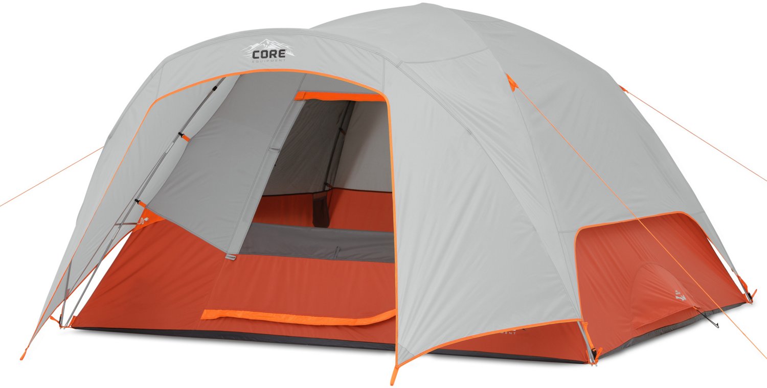 Enjoy a roomy feel while camping with the CORE Equipment 6 Person Dome Tent with Vestibule. The 10-square-foot vestibule offers additional weather-protected storage space. This tent has a 5-1/2-foot center height and hybrid pole connectors create a roomy feel. A fully-taped rainfly, sealed seams and water-repellent polyester keep you dry, while the low air vent and mesh ceilings promote airflow to cool you down.