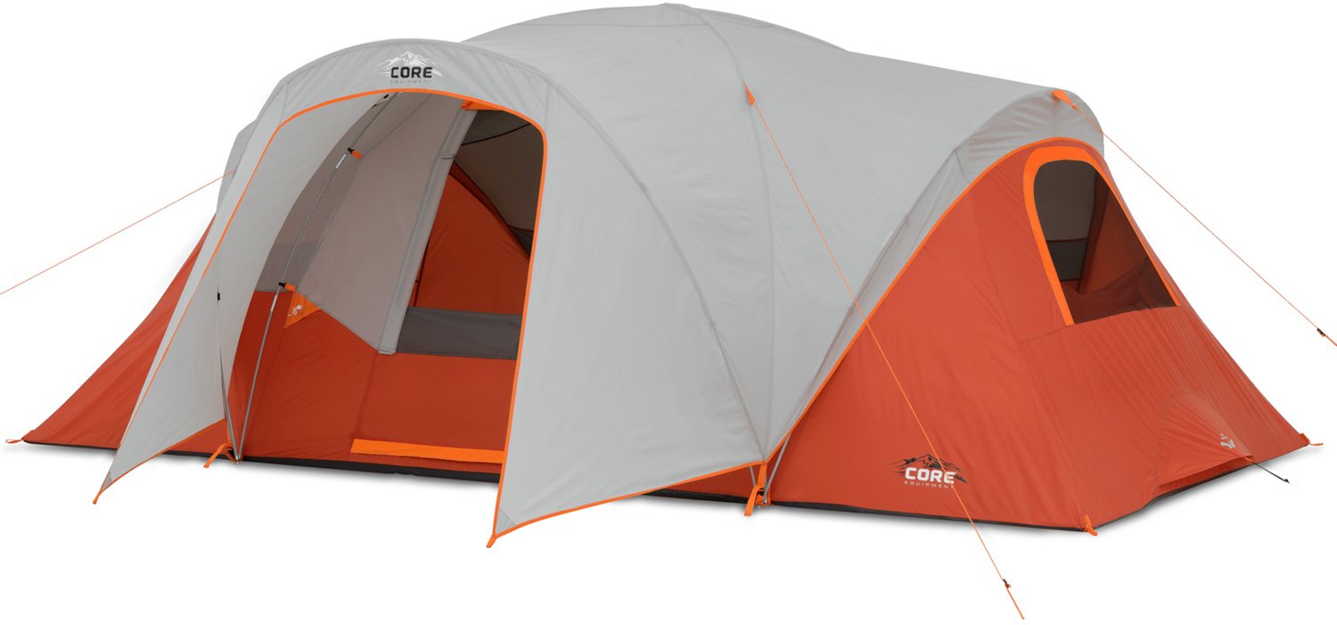 Stay dry and comfortable while camping with the CORE Equipment 9 Person Dome Tent with Vestibule. The 6-foot center height, hybrid pole connectors and 14-square-foot storage vestibule create a roomy feel with plenty of floor space. A fully-taped rainfly and sealed seams protect you from the rain and weather, and an air intake vent and mesh ceilings promote airflow to keep you cool.