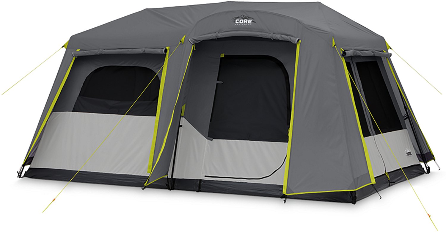 Have extra storage space and privacy while camping with the CORE Equipment 9 Person Instant Cabin Tent with Full Fly. The full rainfly creates a weather-protected vestibule for gear storage, and a room divider helps divide the interior of the tent into two rooms. With a peak height of 6-1/2 feet, you have enough headroom to stand up. Pre-attached poles create a two-minute set up, allowing you to spend more time enjoying the outdoors.