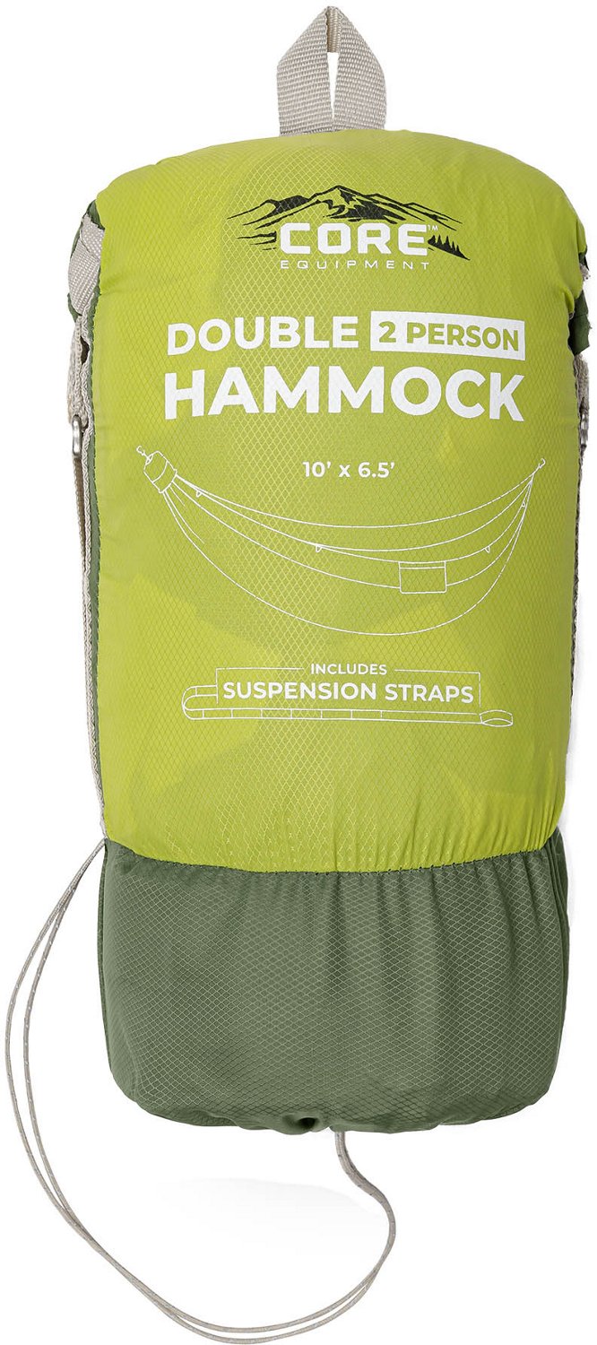 Kick back and relax on the CORE Equipment Double Hammock. The diamond ripstop nylon construction delivers a soft feel and durability, while the 10-foot tree straps and carabiners provide quick and easy setup. The 19 loops on each tree strap make it easy to adjust the height, while 14 webbing loops and a built-in side pocket let you keep personal items handy.