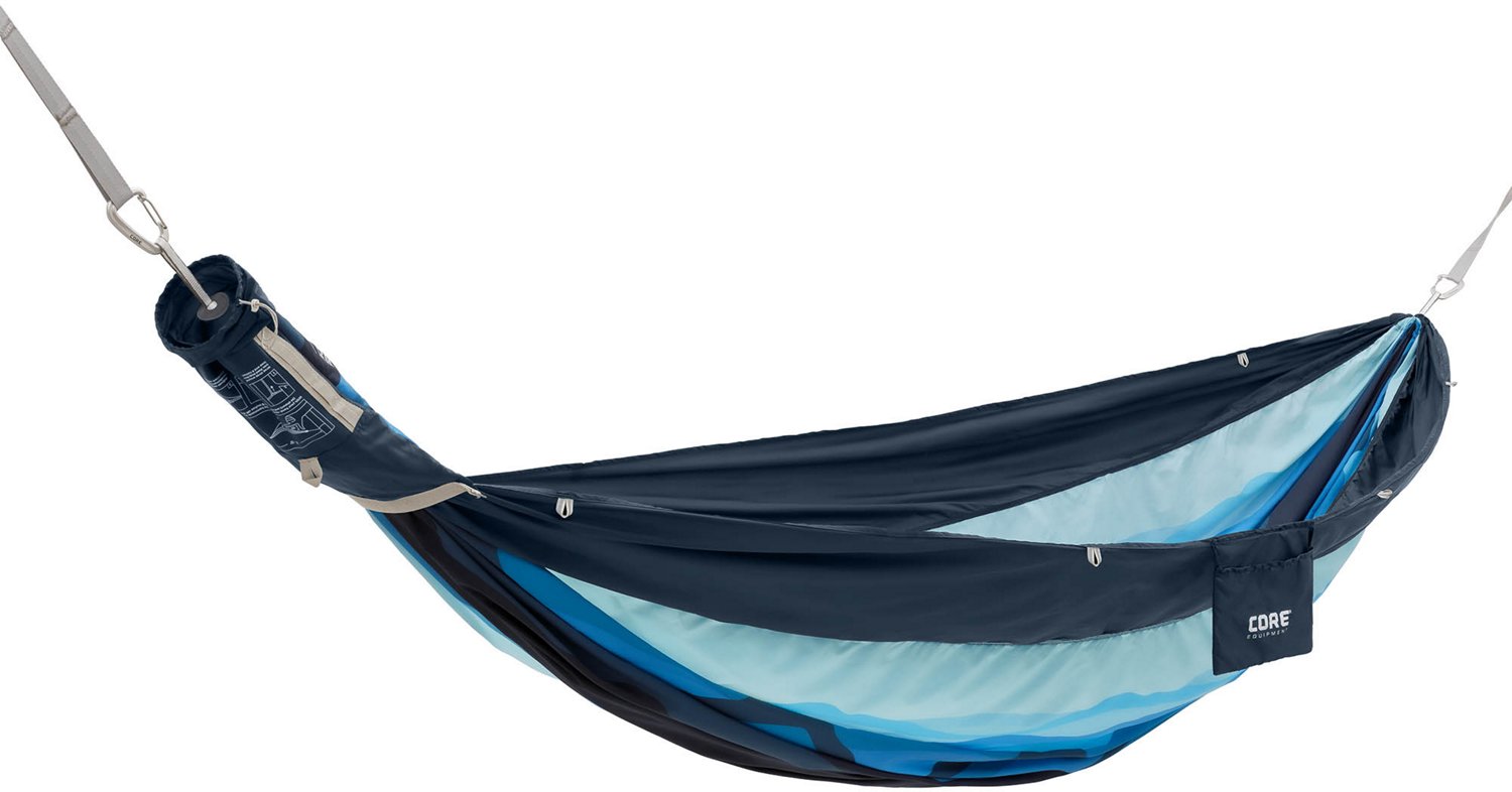 Kick back and relax on the CORE Equipment Double Hammock. The diamond ripstop nylon construction delivers a soft feel and durability, while the 10-foot tree straps and carabiners provide quick and easy setup. The 19 loops on each tree strap make it easy to adjust the height, while 14 webbing loops and a built-in side pocket let you keep personal items handy.