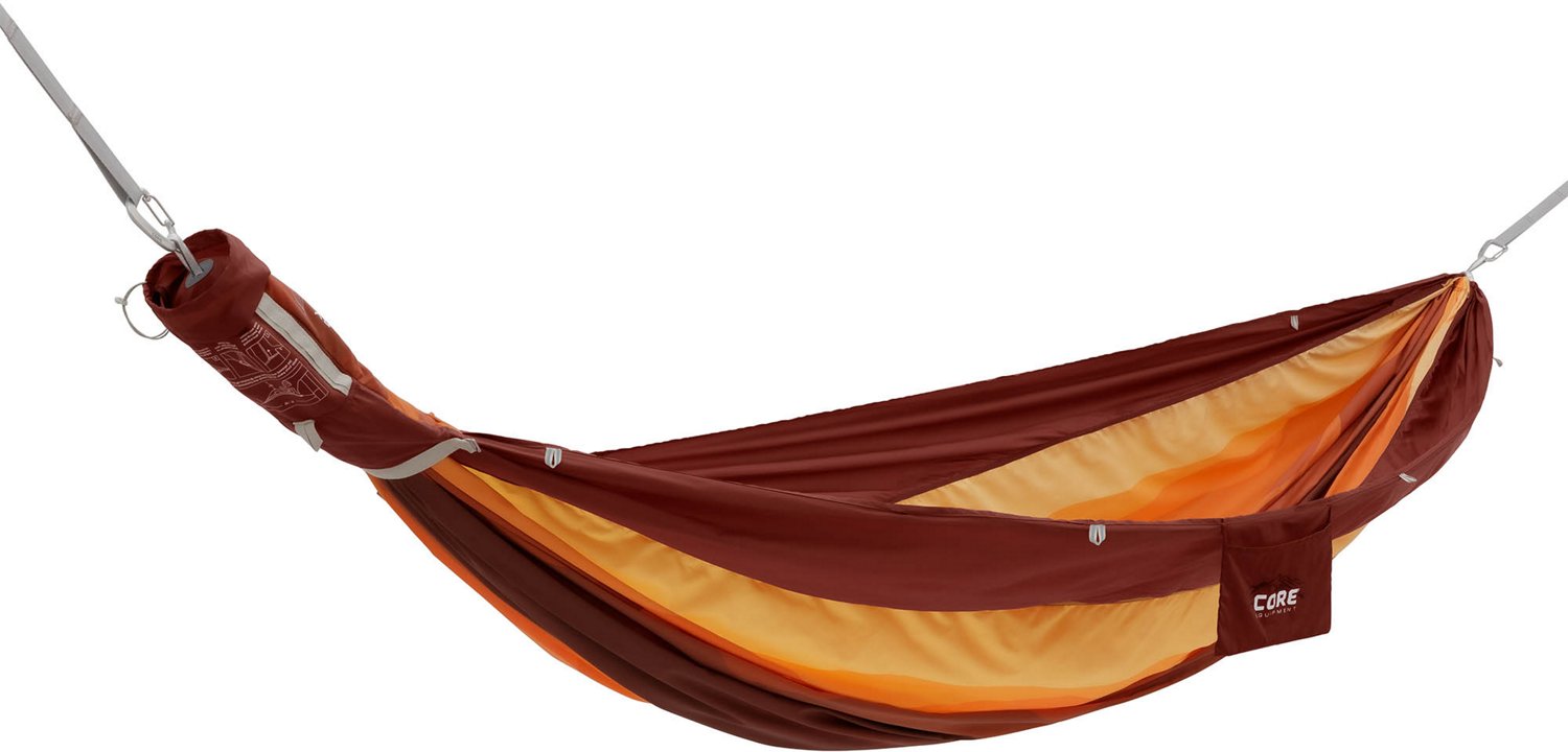 Kick back and relax on the CORE Equipment Double Hammock. The diamond ripstop nylon construction delivers a soft feel and durability, while the 10-foot tree straps and carabiners provide quick and easy setup. The 19 loops on each tree strap make it easy to adjust the height, while 14 webbing loops and a built-in side pocket let you keep personal items handy.