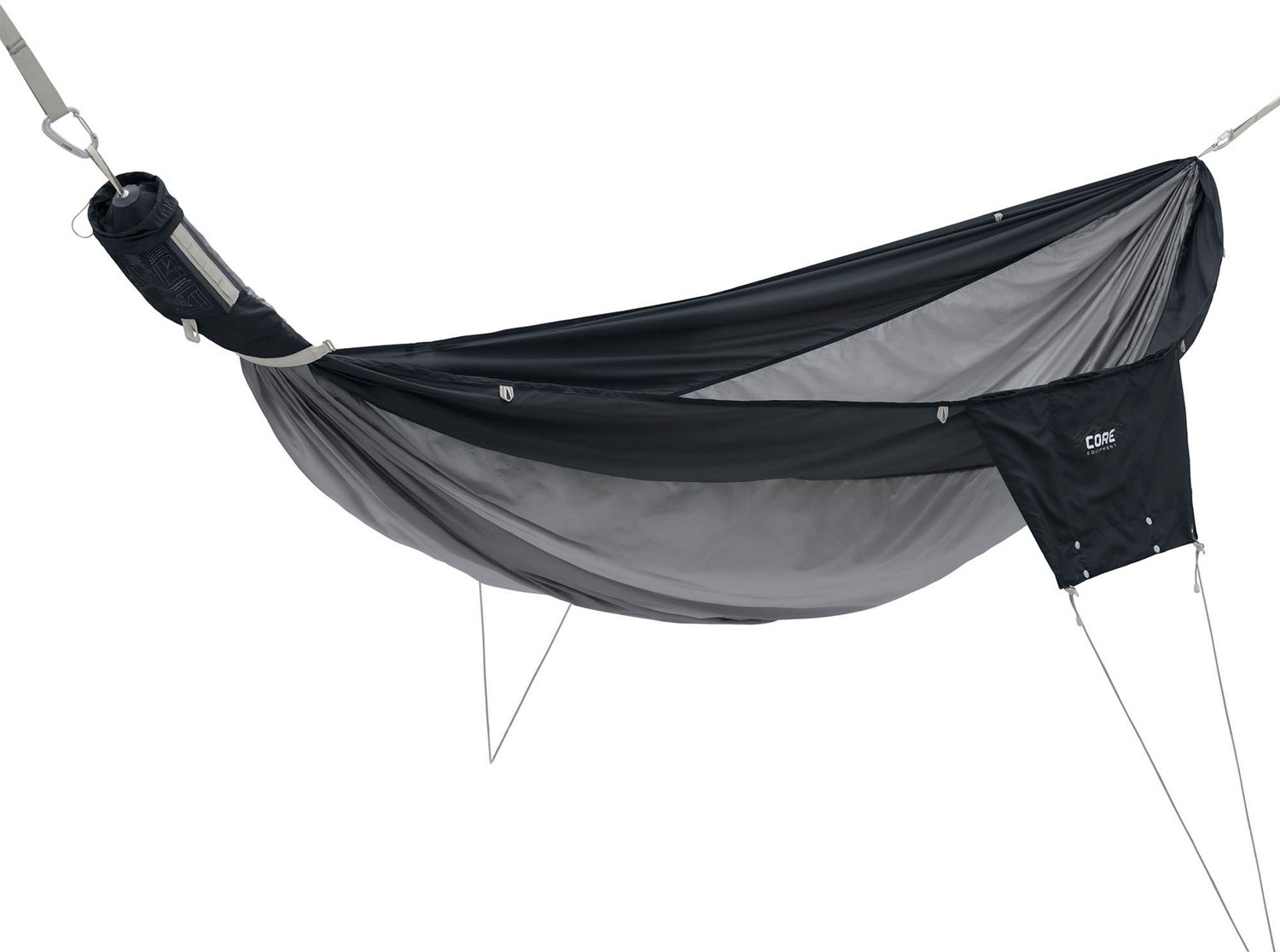 Kick back and relax on the CORE Equipment Performance Double Hammock. The diamond ripstop nylon construction delivers a soft feel and durability, while the 10-foot tree straps and carabiners provide quick and easy setup. The 19 loops on each tree strap make it easy to adjust the height, while 14 webbing loops and a built-in side pocket let you keep personal items handy.