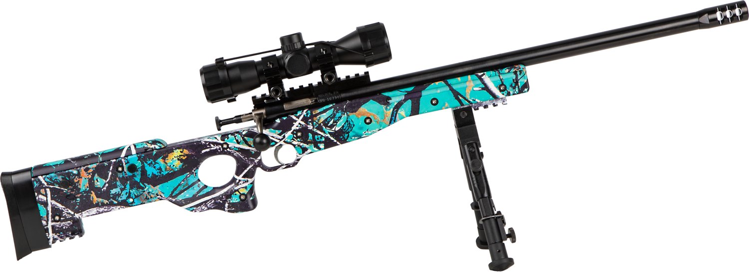 The Crickett Precision Package 22 LR Bolt-Action Combo Rifle has a 16.12-inch threaded bull barrel with a single-shot capacity and a Blued finish. This optics-ready firearm has a steel receiver with integrated rails on the buttstock and forend. This youth-sized rifle also features a Muddy Girl Serenity synthetic thumbhole stock.
