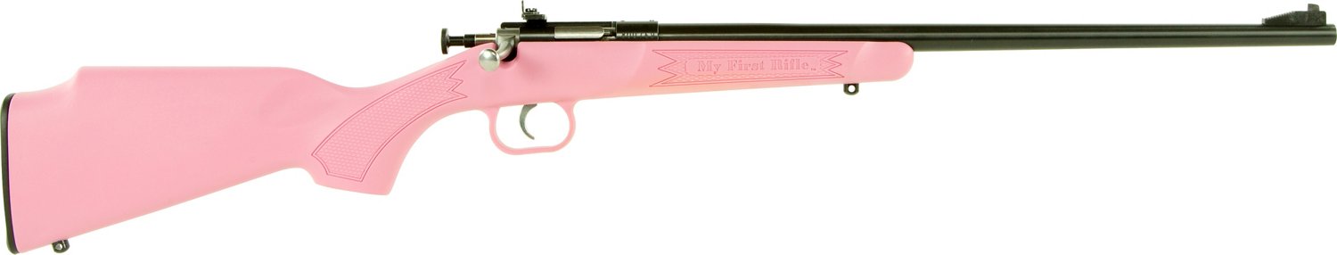 Equipped with both front and rear sights, the Crickett Single Shot Synthetic .22 LR Bolt-Action Rifle features a 16.12-inch barrel and a crowned muzzle. A blued metal finish and a bright synthetic stock complete the design. Other details include a single-stage trigger, an alloy nickel-plated bolt and a manual safety.