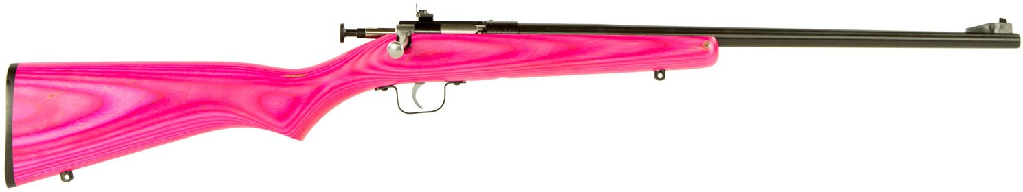 The Crickett Youth Single Shot .22 LR Bolt-Action Rifle is made with a laminate stock. It has a firing pin safety and a single-stage trigger to complement the 16.125-inch barrel. Fixed front and adjustable rear sights are pre-installed.
