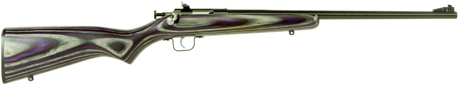Featuring a colorful design, the Crickett Youth Single Shot Laminate .22 LR Bolt-Action Rifle has a laminated wood stock to accent the blued, 16.125-inch barrel. Other highlights include a single-stage trigger, a firing pin safety device and fixed front and adjustable rear sights.