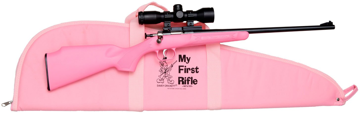 Designed with new shooters in mind, the Crickett Youth Single Shot Synthetic .22 LR Bolt-Action Rifle Package offers a firing pin safety and a 1-shot capacity. It's built with a blued 16.125-inch barrel and a colored synthetic stock. Includes fixed front and adjustable rear sights.