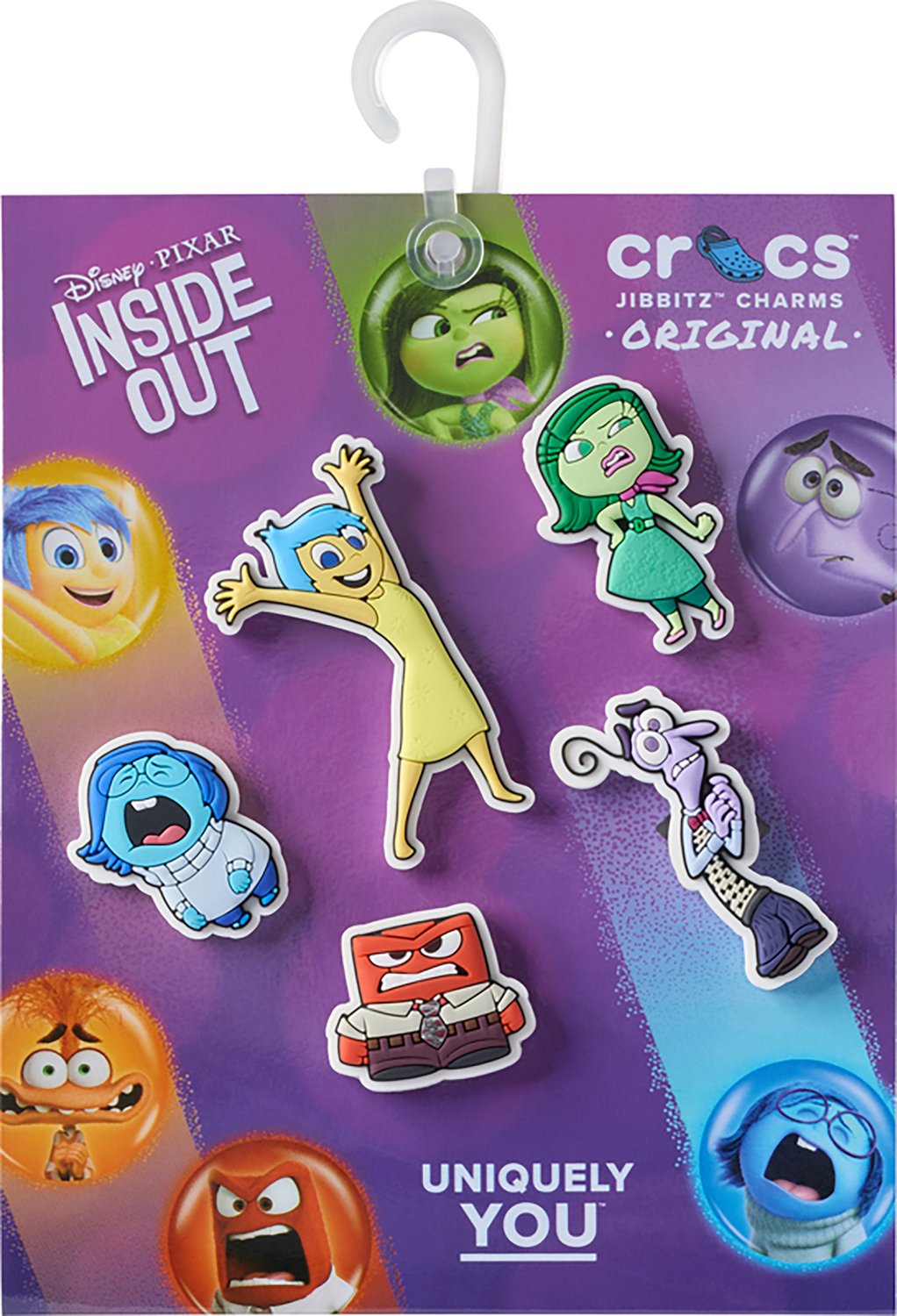 Personalize your shoes with the Crocs Jibbitz Pixar Inside Out 5-Pack. Its allows you to pop some personality into your shoes. The Inside Out charms show off your favorite characters, and it accessorizes your favorite pairs of clogs, slides, and more. The charms are not intended for kids under 3 years of age.