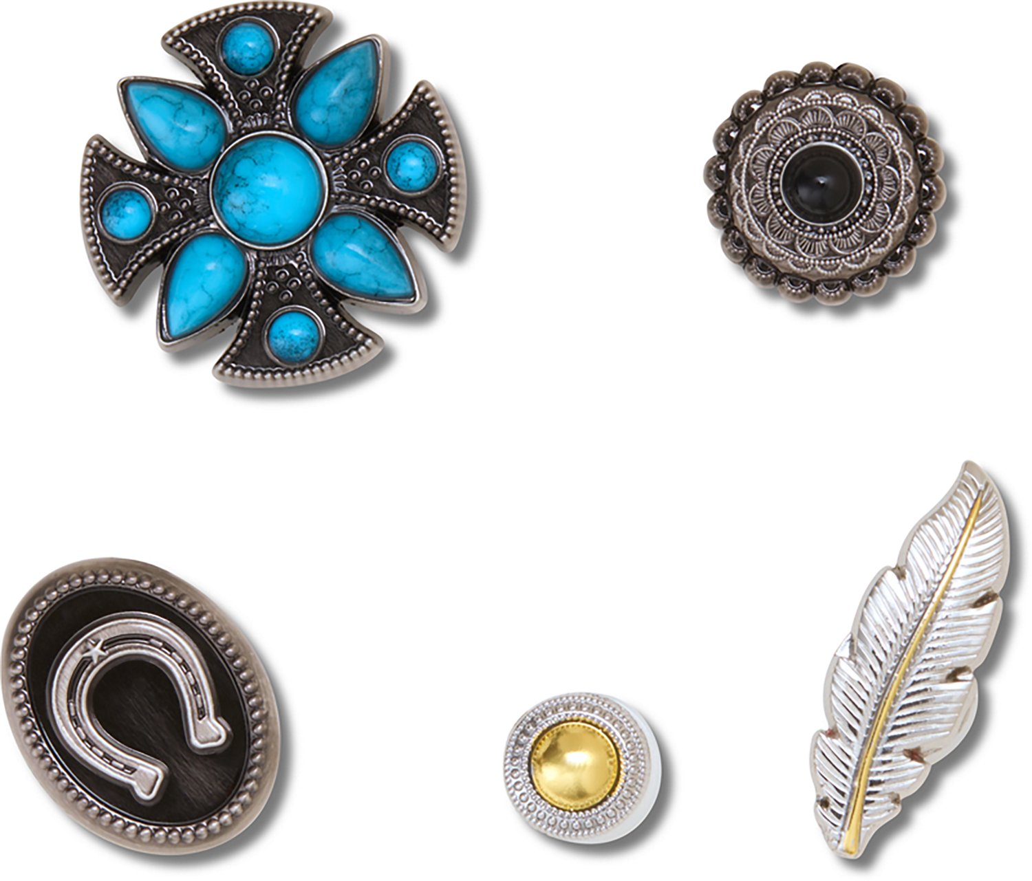 Personalize your shoes with the Crocs Jibbitz SMT Turquoise and Silver 5-Pack. Its allows you to pop some personality into your shoes. The turquoise and silver charms show off your favorite colors, and it accessorizes your favorite pairs of clogs, slides, and more. The charms are not intended for kids under 3 years of age.