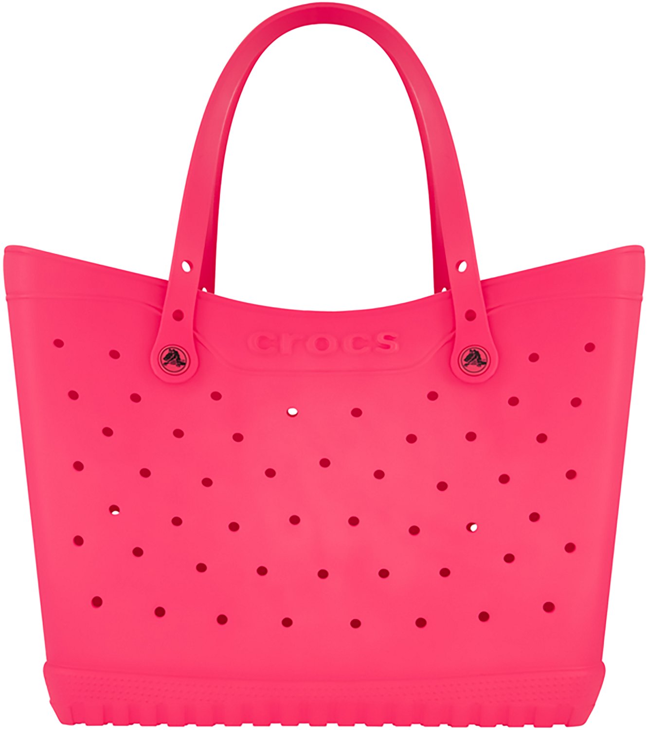 Carry all of your essentials in the Crocs Large EVA Tote Bag. Its 100% EVA construction is extremely durable. The main compartment fits up to 5 beach towels, throw blankets, snacks, drinks, and toiletries, and its 11-inch EVA top handle strap helps carry the load. The tread on the base to keep it from slipping on wet surfaces.
