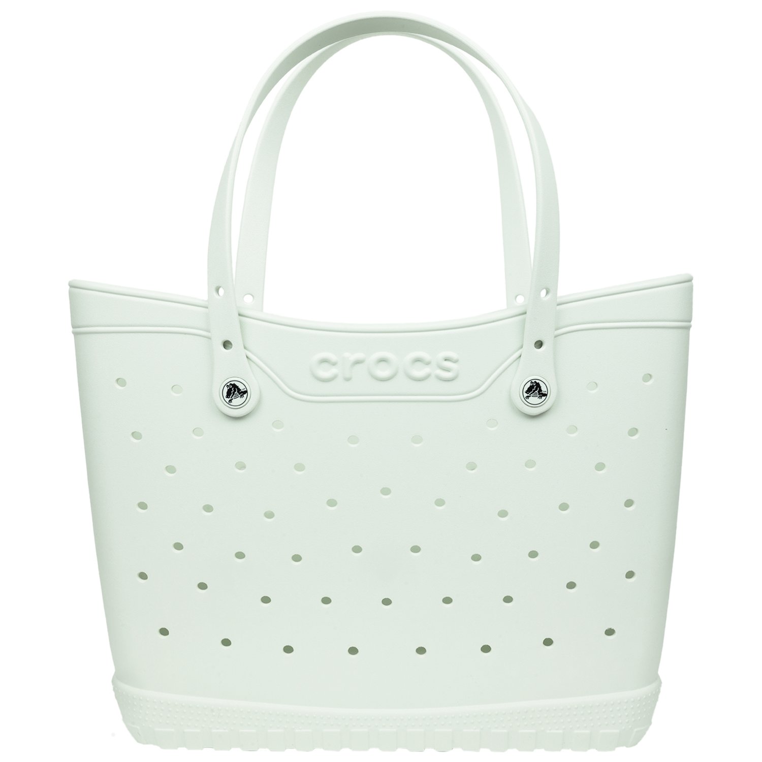 Carry all of your essentials in the Crocs Large EVA Tote Bag. Its 100% EVA construction is extremely durable. The main compartment fits up to 5 beach towels, throw blankets, snacks, drinks, and toiletries, and its 11-inch EVA top handle strap helps carry the load. The tread on the base to keep it from slipping on wet surfaces.