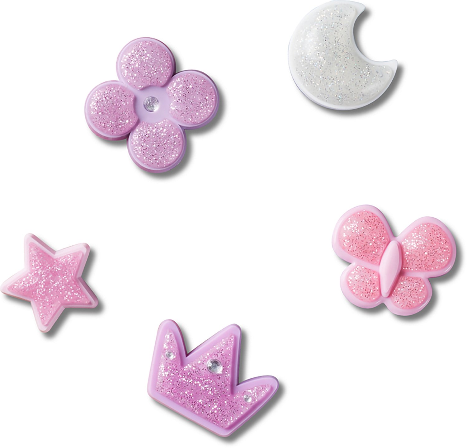 Accessorize with the Crocs Tiny Glitter Girl Icons Jibbitz 5-Pack. These Jibbitz fit into most clogs and slides, and they boast a unique design that adds a fun touch to your look.
