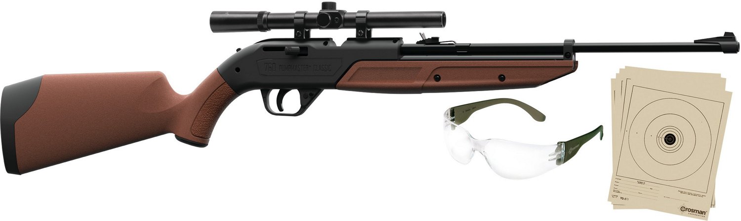 The Crosman 760 Pumpmaster Air Rifle Kit comes with a pneumatic pump air rifle designed to shoot both .177 caliber pellets and BBs. Complete with a 4 x 15 scope, the air rifle shoots BBs at up to 625 fps and pellets at up to 600 fps. The rifle comes with 5 paper targets and shooting glasses.