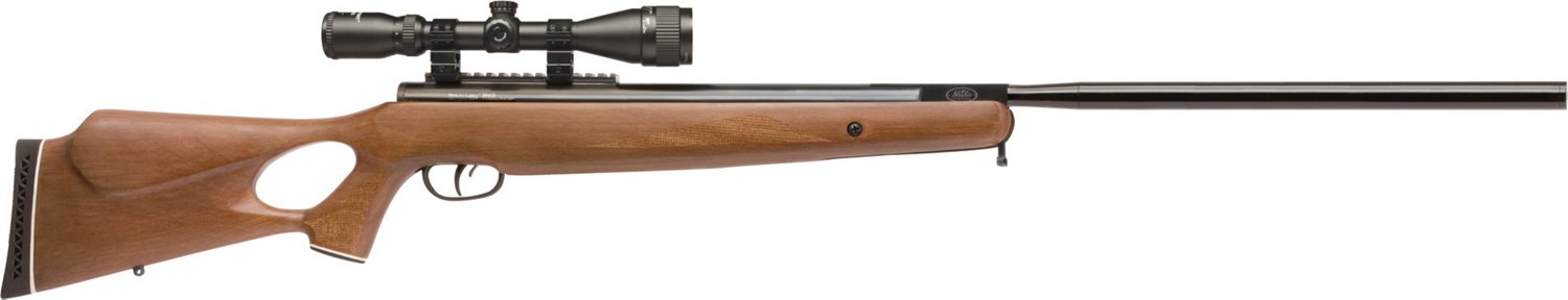 The Crosman Benjamin Trail NP XL 725 Air Rifle features a rifled steel barrel and a hardwood stock. This nitrogen-powered, break-barrel air rifle shoots .25 alloy pellets at up to 900 fps, making it useful for hunting small game and varmints. The 3 - 9 x 40 mm AO scope sits on a Picatinny-style rail. Lever safety.