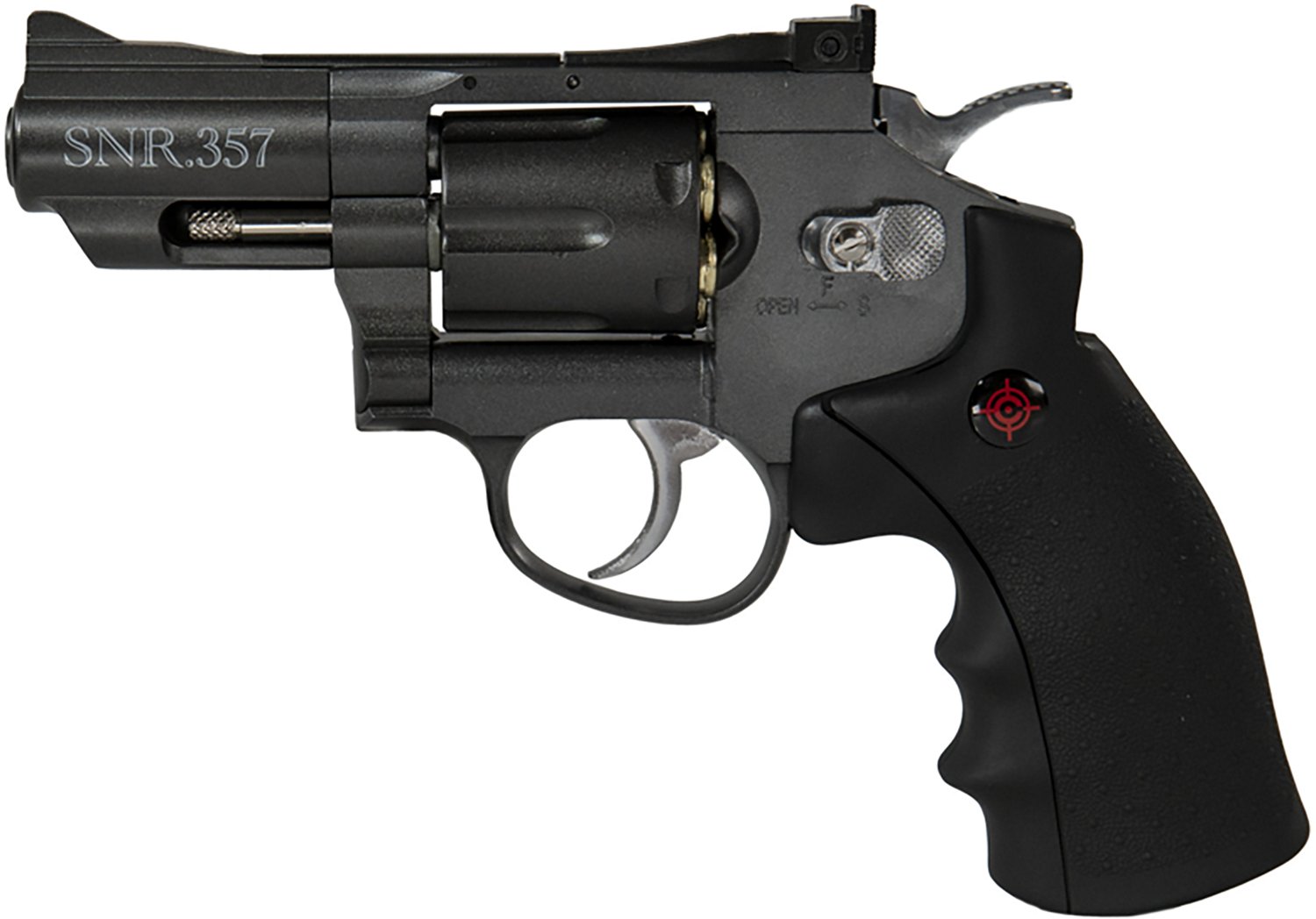 The Crosman SNR357 Semi Auto BB and Pellet Air Revolver is a semiautomatic single or double action that is compatible with both BBs and .177 caliber pellets. The smooth bore metal barrel holds up to 12 rounds and is CO2 powered. It has a dovetail mounting rail for easy accessory attachments, a 6-shot swing-out cylinder. The grip is removable and provides a comfortable grip and allows easy replacement of CO2 canisters.