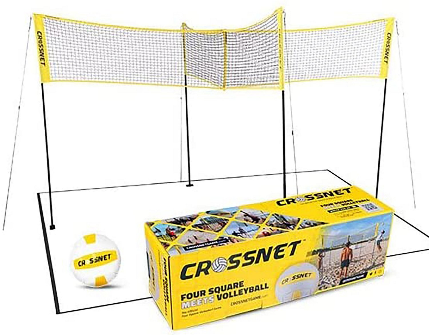 CROSSNET is the world's first four-way volleyball game that combines traditional volleyball with four square rules, in a competitive game to 11, win by 2. CROSSNET features a four-way net that is adjustable for men's, women's, and children's outdoor volleyball heights. Each set includes a travel backpack, volleyball, and pump.
