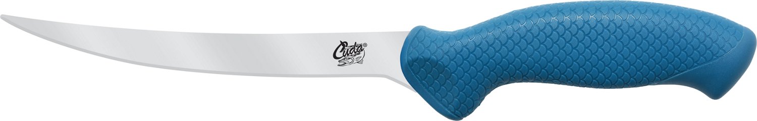 Separate fish meat from the bone with ease using the Cuda 6 in Aquatuff Curved Boning Knife. This durable knife features tungsten carbide edges and zirconium bonding. The silicone handle offers a nonslip grip in any weather, while the full blade cover protects the blade and your hand between uses.