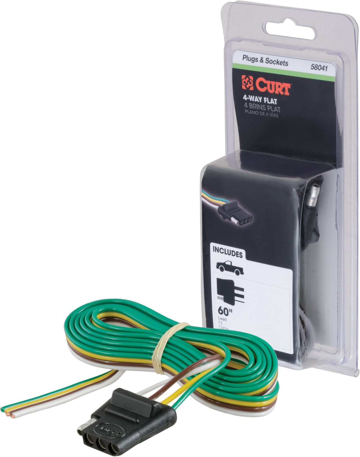 For a reliable connection in your vehicle, use the CURT 4-Way Flat Connector Socket with 60 in Wires. This 4-way flat connector is designed to supply power for tail lights, turn signals and brake lights and a ground connection. It features a durable rubber-molded construction and 60 inches of standard color-coded, bonded loop wire to easily splice into your vehicle's wiring system.