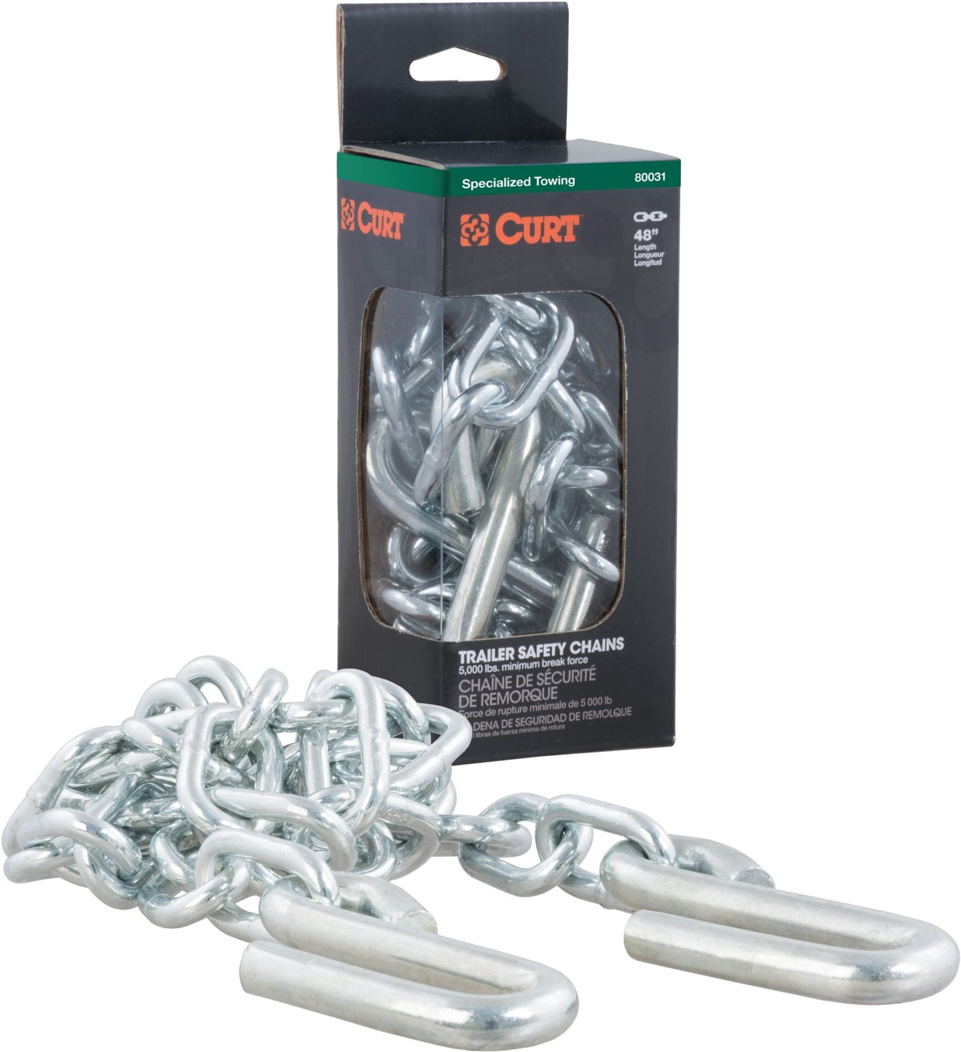 Meet safety requirements while towing with the CURT 48 in Safety Chain with 2 S-Hooks. This grade-30 certified basic safety chain is made from high quality steel and protected by a durable zinc-plated finish. It is equipped with two sturdy 7/16 inch S-hooks for reliable coupling to your vehicle and has a minimum break force of 5,000 pounds.