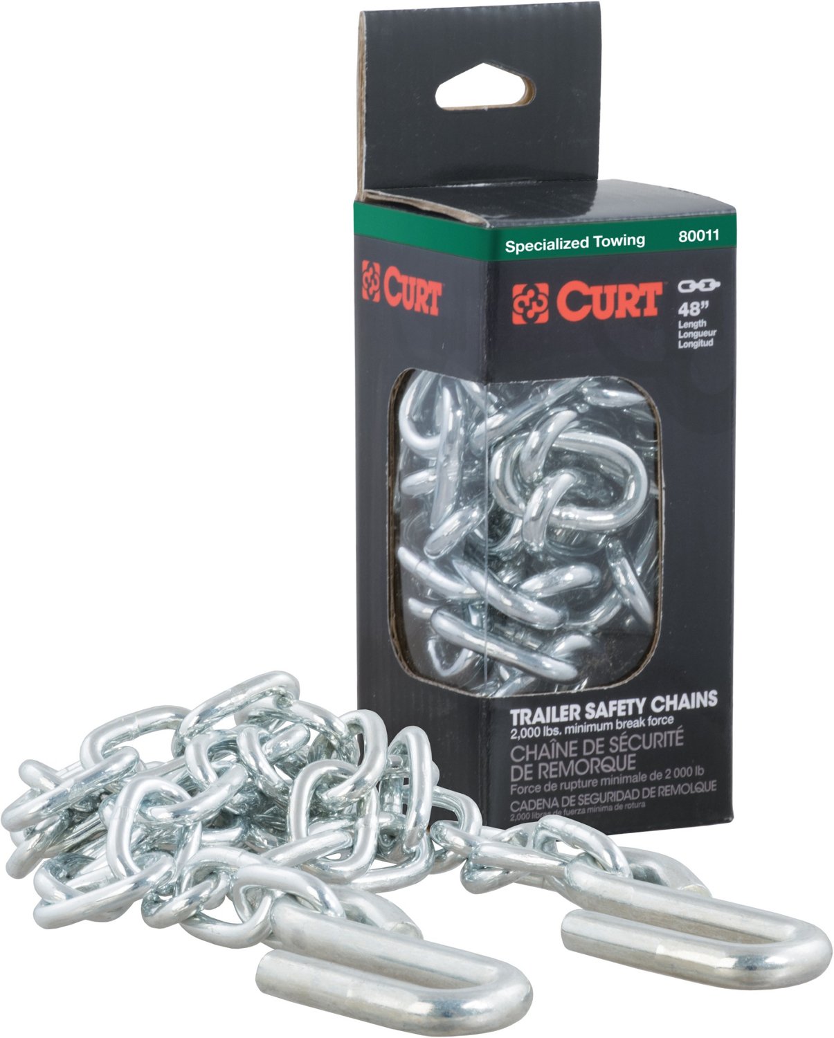 Help resist complete vehicle-trailer separation during a disconnect with the CURT 48 in Safety Chain with 2 S-Hooks. This is a grade-30 certified safety chain made from high-quality steel and protected by a durable zinc-plated finish. It is equipped with 2 sturdy .375 inch S-hooks for reliable coupling to your vehicle and features a minimum break force of 2,000 pounds.