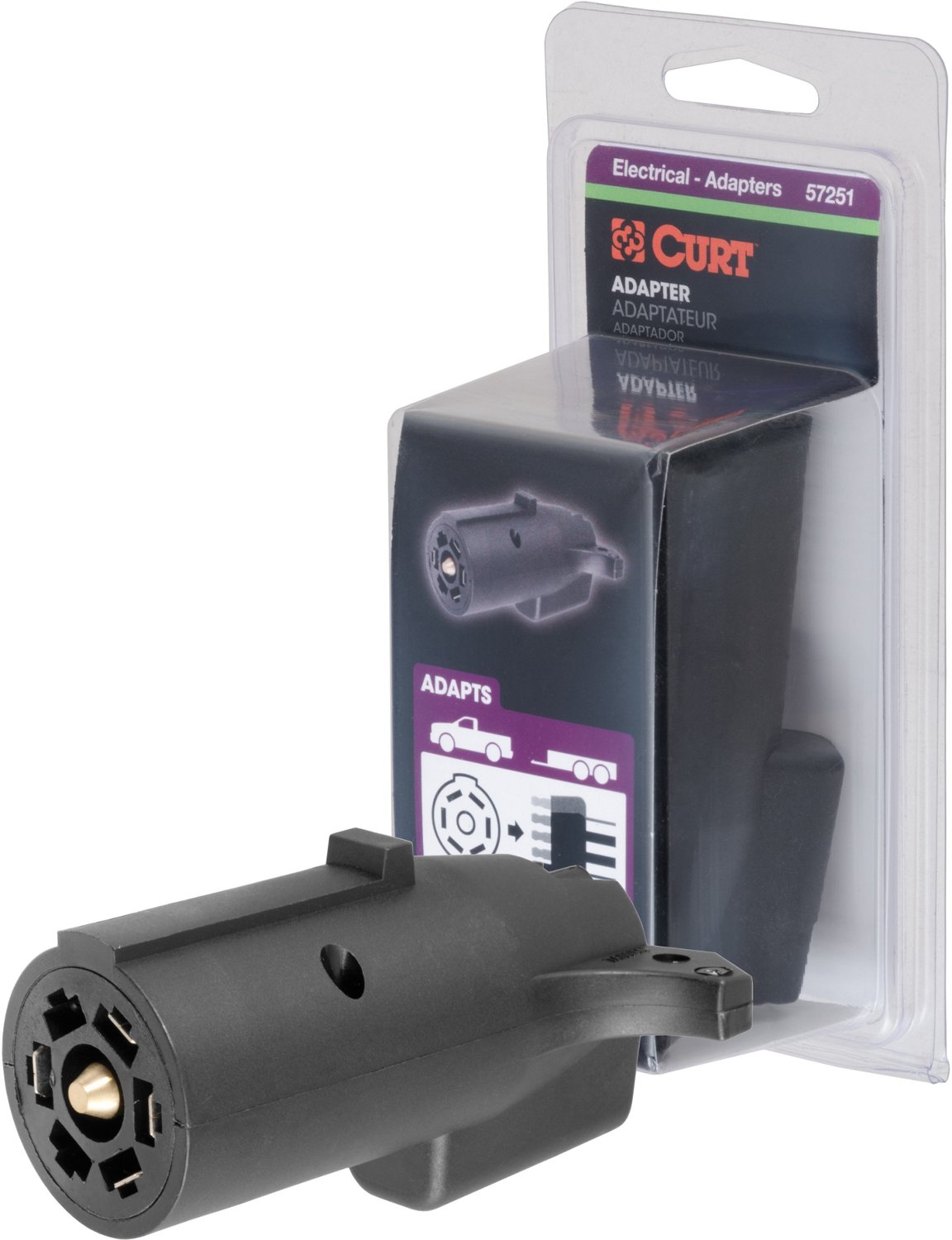 Be prepared and easily adapt with the CURT Electrical Adapter. This adapter adapts a 7-way RV blade vehicle socket to fit 5-way flat trailer plugs, and the 5-way flat connects tail lights, brake lights, turn signals and reverse lights. The simple plug-and-play design eliminates the need for cutting or splicing.
