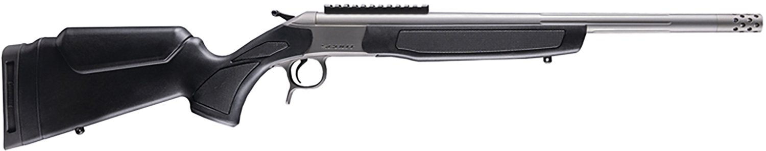 The CVA Scout Takedown .45-70 Govt Single Shot Rifle boasts single shot action and has a single-round capacity. It's built with a threaded barrel, synthetic stock and a hammer block. This centerfire rifle has a 22-inch barrel length, is drilled and tapped for a scope and weighs 7.8 pounds. The CVA Scout Takedown .45-70 Govt Single Shot Rifle is also equipped with a 0 MOA Durasight rail base, reversible hammer spur and a muzzle brake.