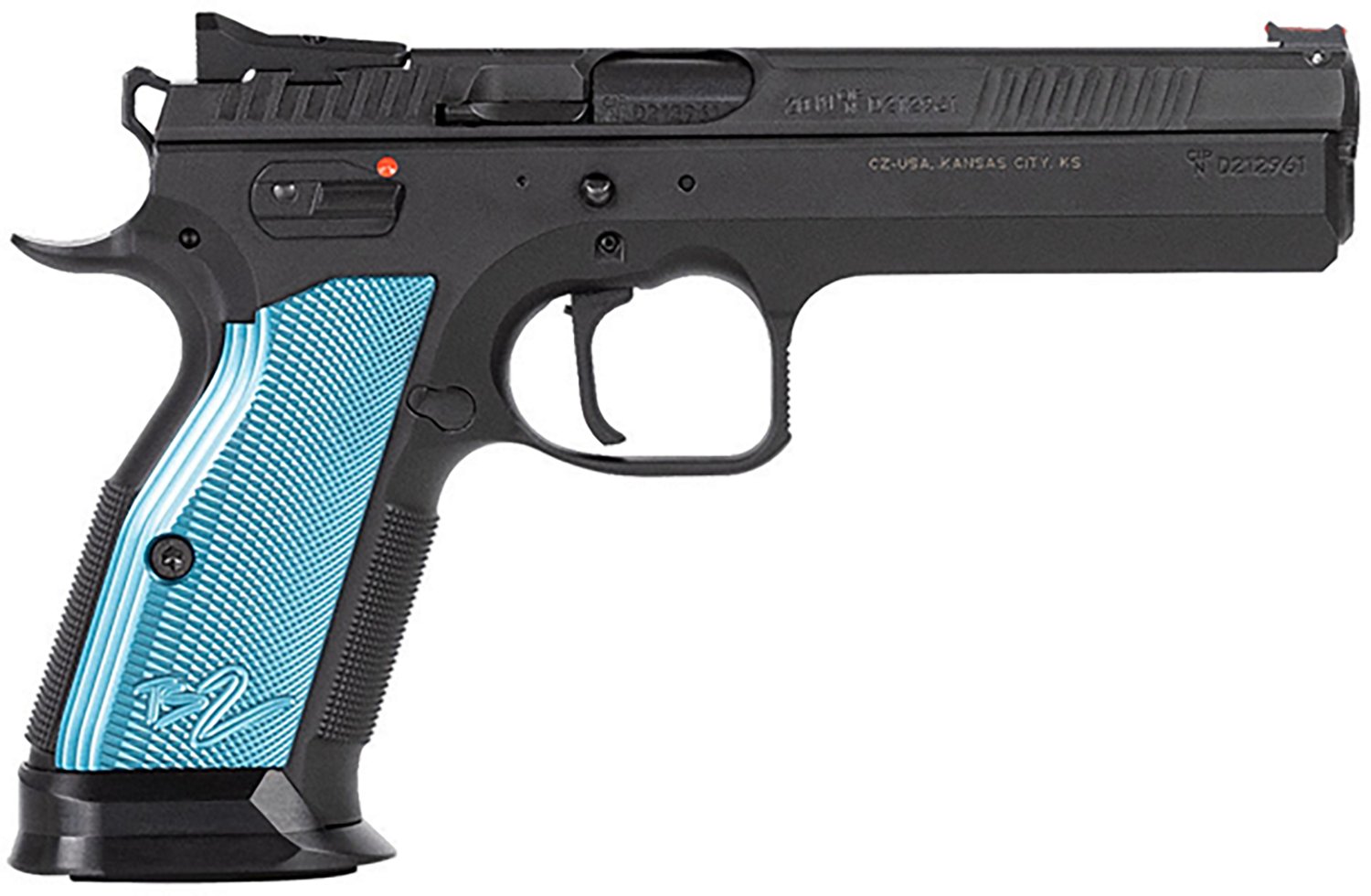 Arm yourself with the CZ 75 TS2 9mm Pistol. It is single action with a 10-round capacity. The barrel with a black polycoat/nitride finish is 5.23-inches long, and it is equipped with an aluminum grip. The fiber optic front sight and adjustable rear sight finish off the design.