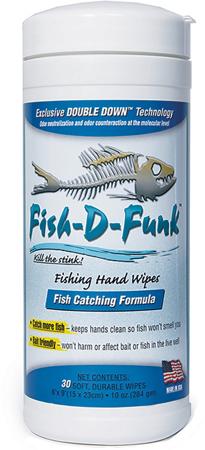 Clean your hands and fishing tools with the D-Funk Fish-D-Funk Non Scented Wipes 30-Pack. This 30-pack of wipes features a special formula that works to both neutralize and counteract bad odors at a molecular level, leaving your hands smelling fresh. The wipes allow controlled application and are non-scented.