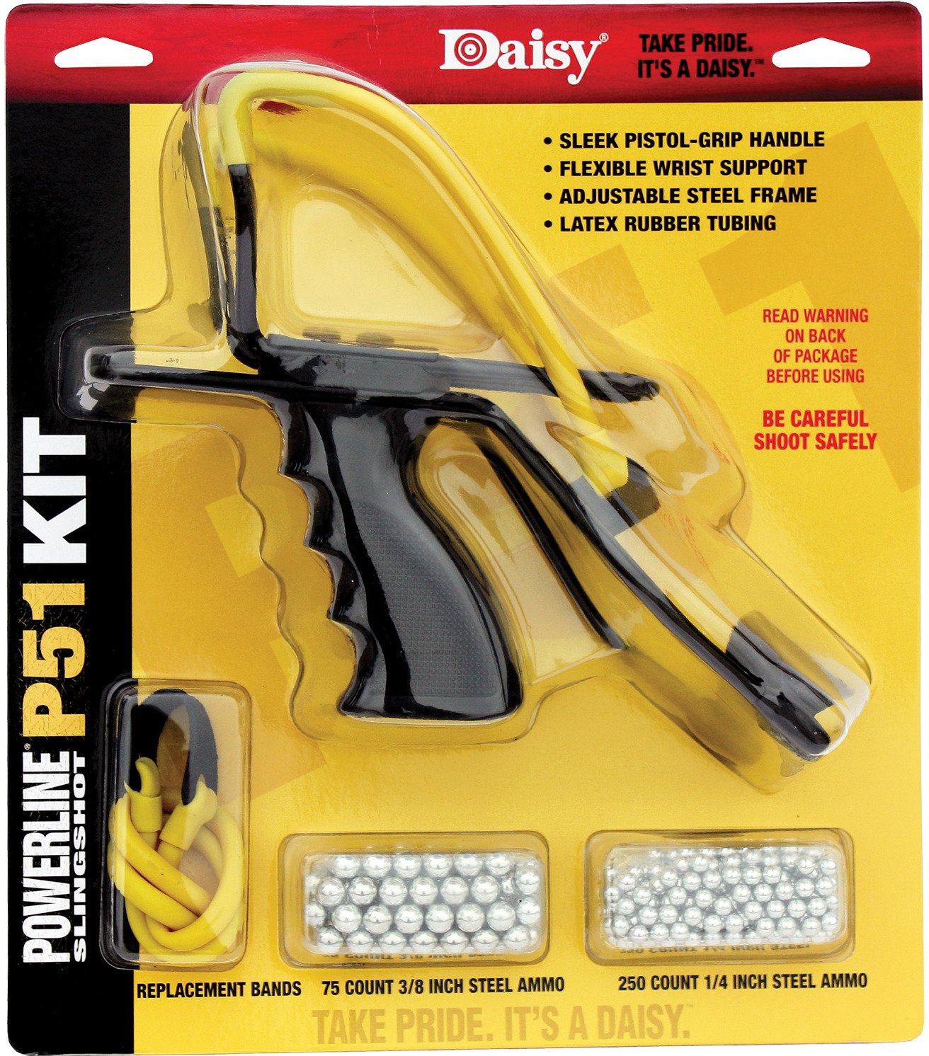 The Daisy Powerline Slingshot Kit features a P51 slingshot with a rubber cord and a plastic grip with an adjustable support for right- or left-handed use. The slingshot is compatible with marbles (sold separately) and steel shot. Replacement band, 75-count 3/8" steel ammo and 250-count 1/4" steel ammo included.