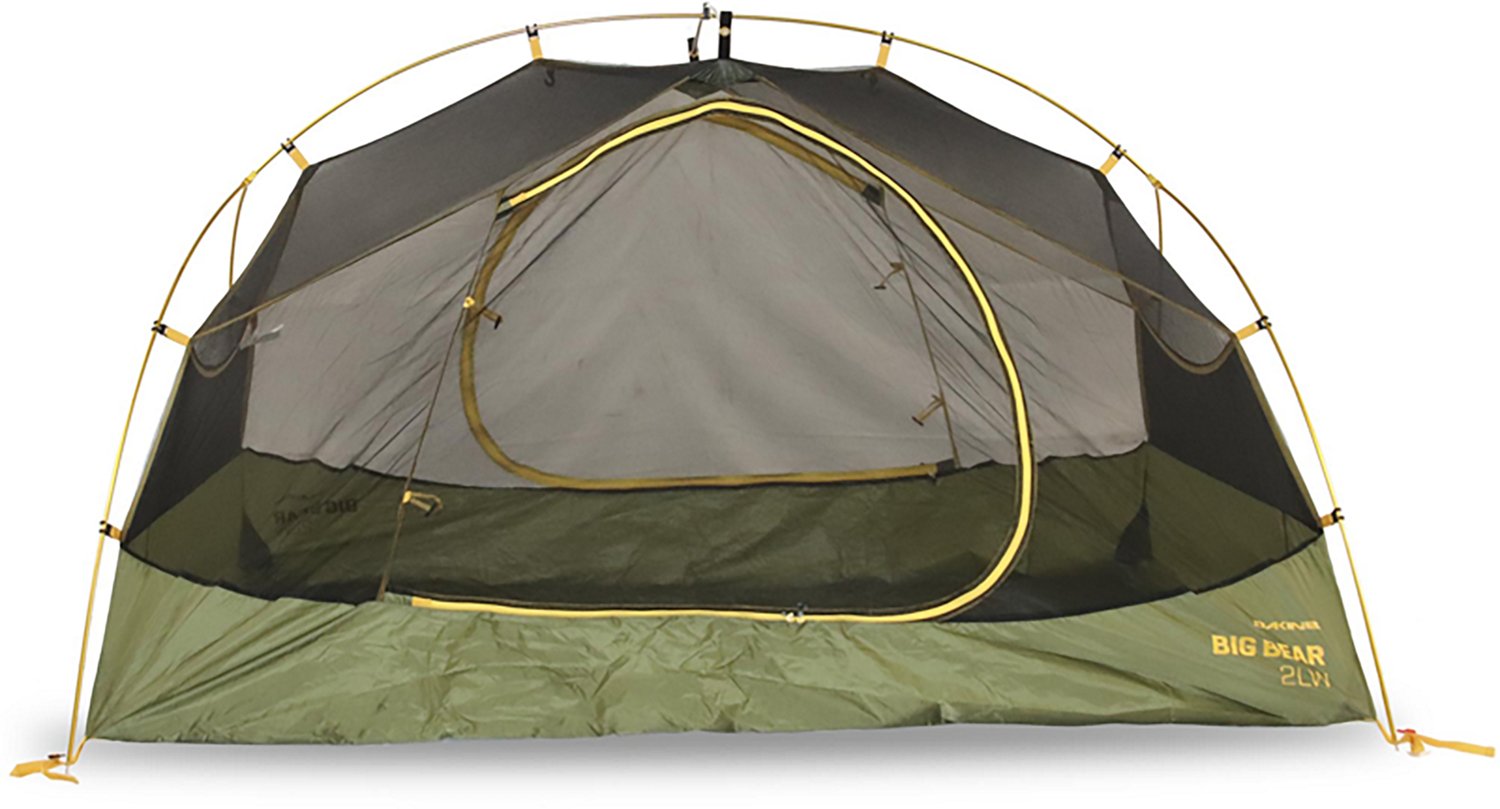 Set up your campsite with the Dakine Big Bear 2-Person Tent. The nylon taffeta and polyester construction affords durability, while the waterproof rainfly helps keep you dry. The mesh side panels, multiple vents and a high/low venting door promote breathability, and the post and grommet corner attachments allow for easy setup.
