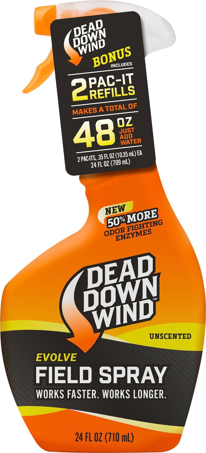 Designed to help eliminate a broad spectrum of odors, the Dead Down Wind Evolve 3D+ 24 oz Field Spray Pac-It Combo will be a must-have hunting accessory. The combo includes a 24-ounce bottle of field spray and 2 PAC-IT refill bottles, so you can keep odors away all season long.