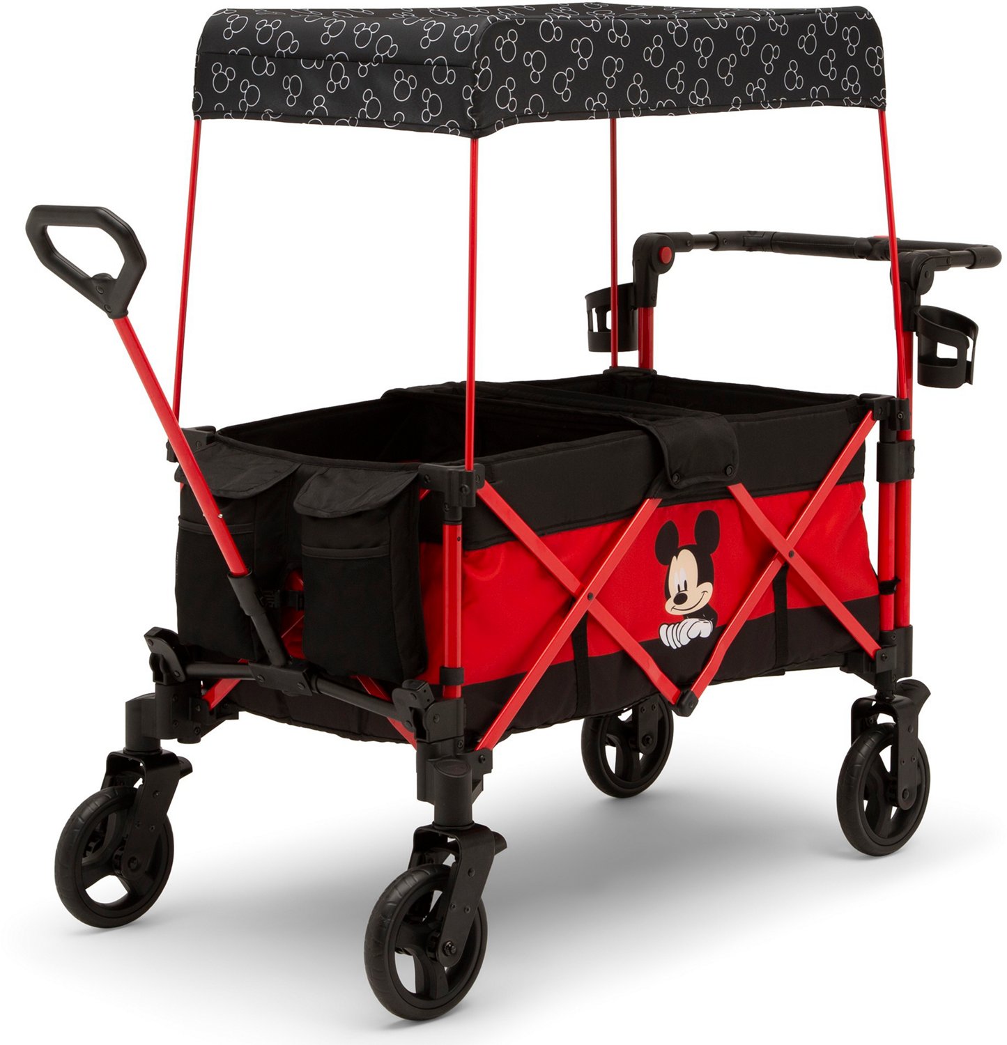 Take your little one on the go with the Delta Mickey Wagon. This 2-person stroller wagon features puncture-proof EVA tires, adjustable handles and a swivel front for effortless control even over rough terrain. A UV-blocking canopy protects kids from the sun while 3-point harnesses ensure a secure ride. Spacious storage keeps belongings handy for both you and your child.