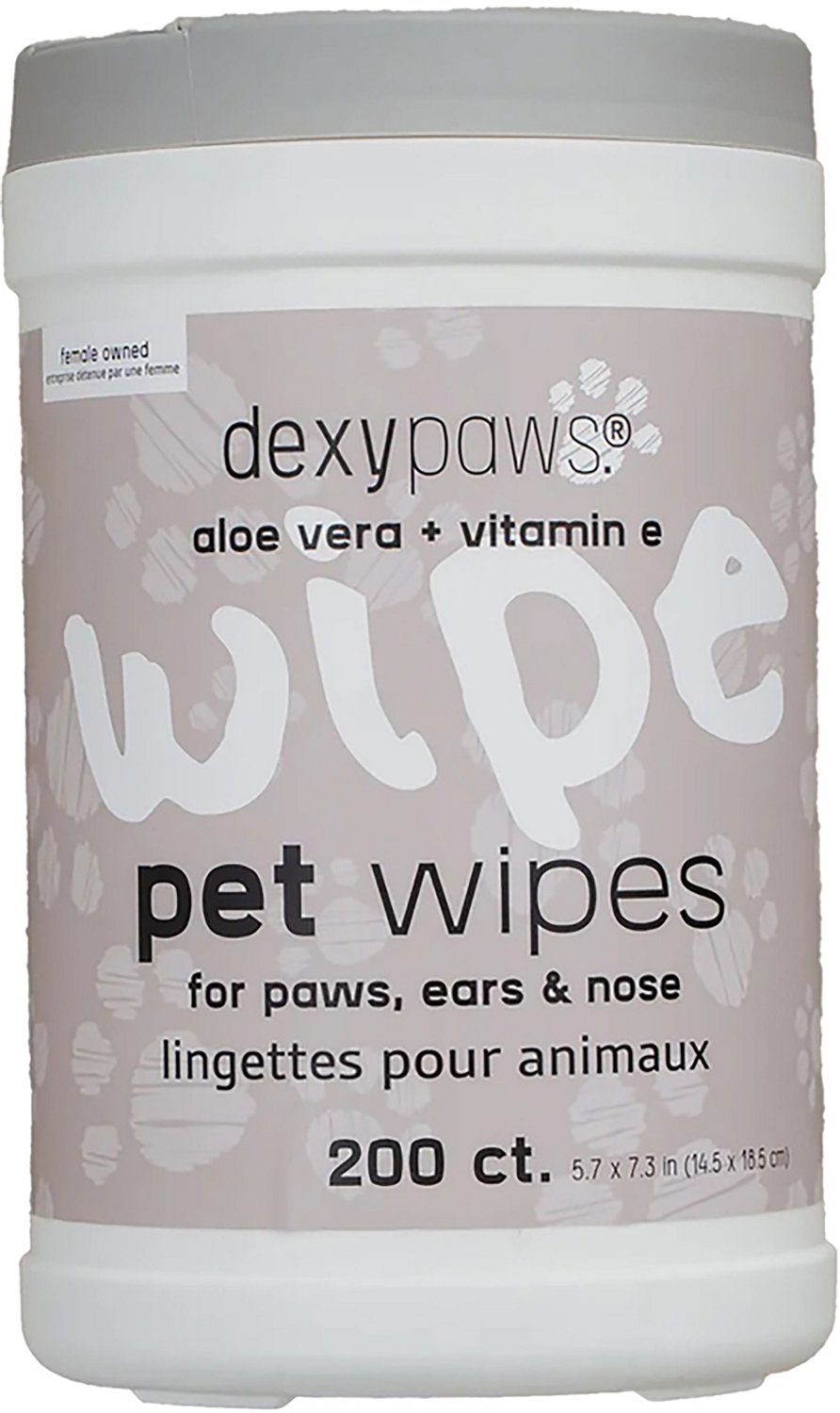 Wipe down your furry friend after walks with the Dexypaws Cleansing Wipes Canister. Soothing aloe vera and vitamin E helps calm and nourish skin, while the canister keeps wipes fresh and moist.