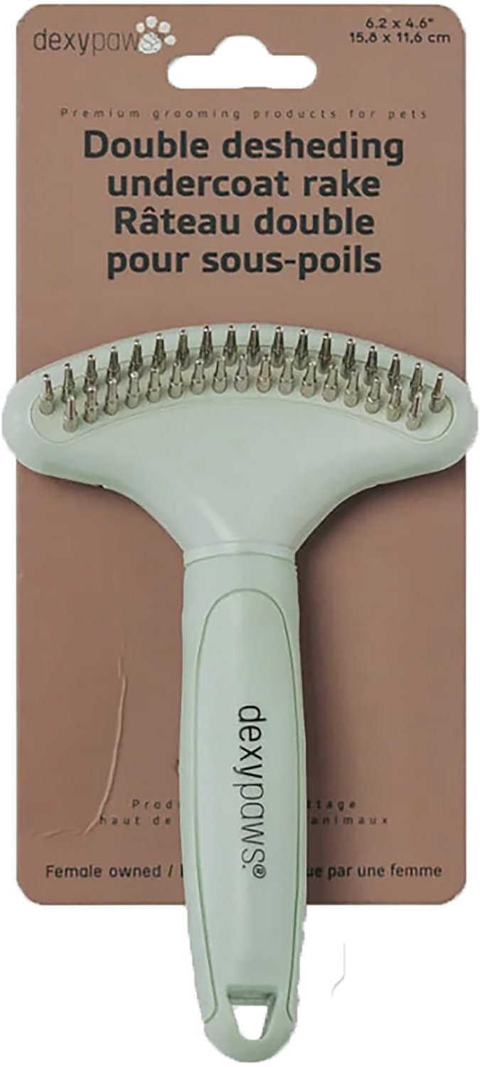 Groom your pet with the Dexypaws Double Deshedding Undercoat Rake. Its dual-row stainless steel teeth glides through your pet’s topcoat to gently and effectively remove loose fur, mats, and dense undercoat buildup without scratching or irritating the skin. The rake offers effective shedding control that helps keep your pet comfortable and your home cleaner, and its ergonomic, non-slip handle is contoured for comfort and grip, reducing hand fatigue during extended grooming sessions and giving you greater control and ease. The rake is ideal for medium to large dogs and long-haired breeds.