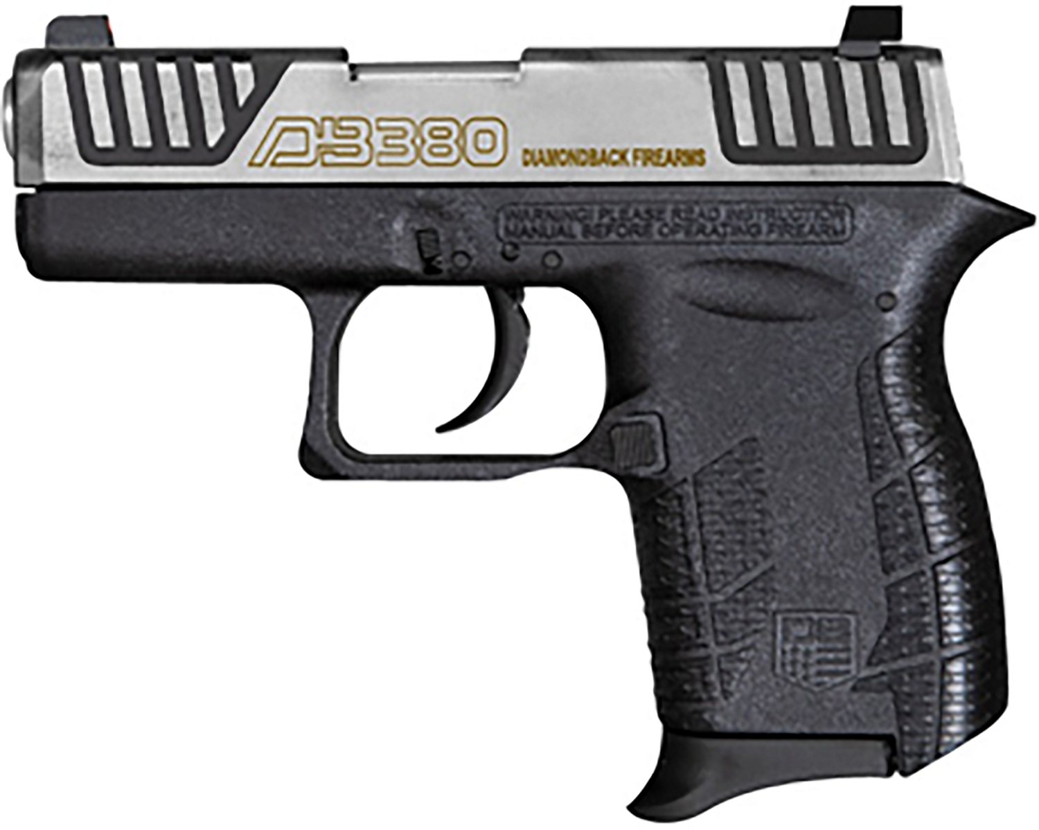 The Diamondback DB380 .380 ACP Pistol is double action and has a 6-round capacity. It's built with a stainless-steel barrel, a serrated stainless-steel slide and a polymer frame with beavertail. A mint polymer grip, 3-dot/GLOCK compatible sights and a firing pin safety complete the design.