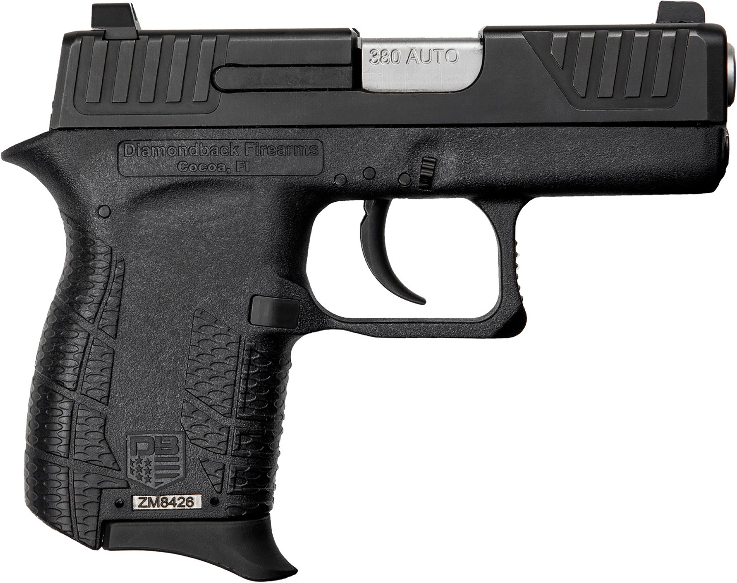 The Diamondback DB380 Gen4 .380 ACP Pistol is double action and has a 6-round capacity. It's built with a stainless-steel barrel, a serrated stainless-steel slide and a polymer frame with beavertail. A polymer grip, 3-dot/GLOCK compatible sights and a firing pin safety complete the design.