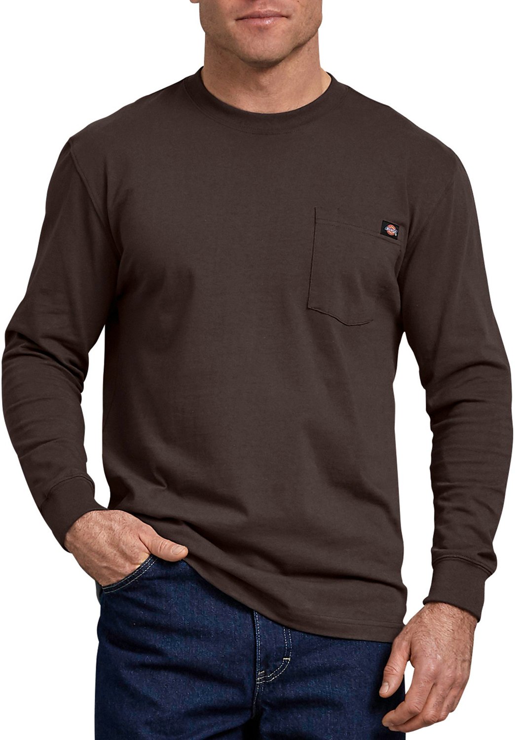 The Dickies Men's Heavyweight Crew Neck Long Sleeve T-shirt is made of 100% cotton (solid) or 90% cotton and 10% polyester (heathered) and features a taped neck and shoulder seams for durability. This heavyweight T-shirt offers 1 pocket and a tagless back neck for comfortable wear. Long sleeves.