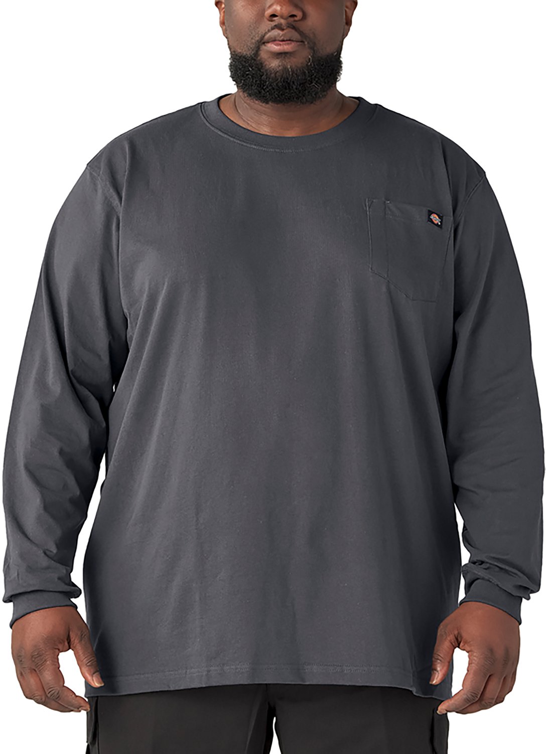 The Dickies Men's Heavyweight Crew Neck Long Sleeve T-shirt is made of 100% cotton (solid) or 90% cotton and 10% polyester (heathered) and features a taped neck and shoulder seams for durability. This heavyweight T-shirt offers 1 pocket and a tagless back neck for comfortable wear. Long sleeves.